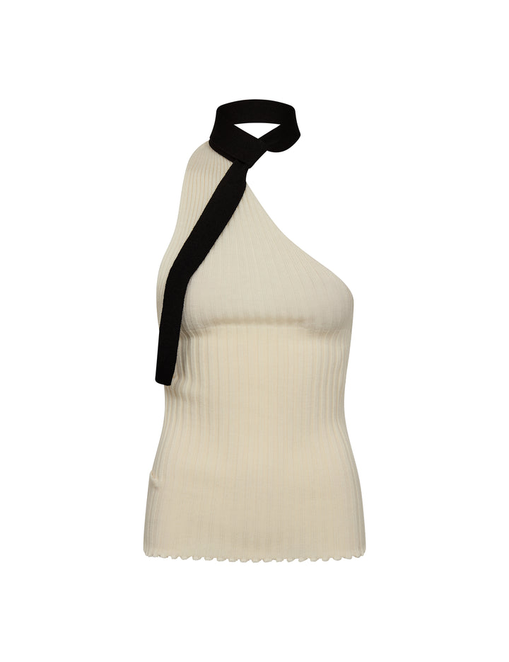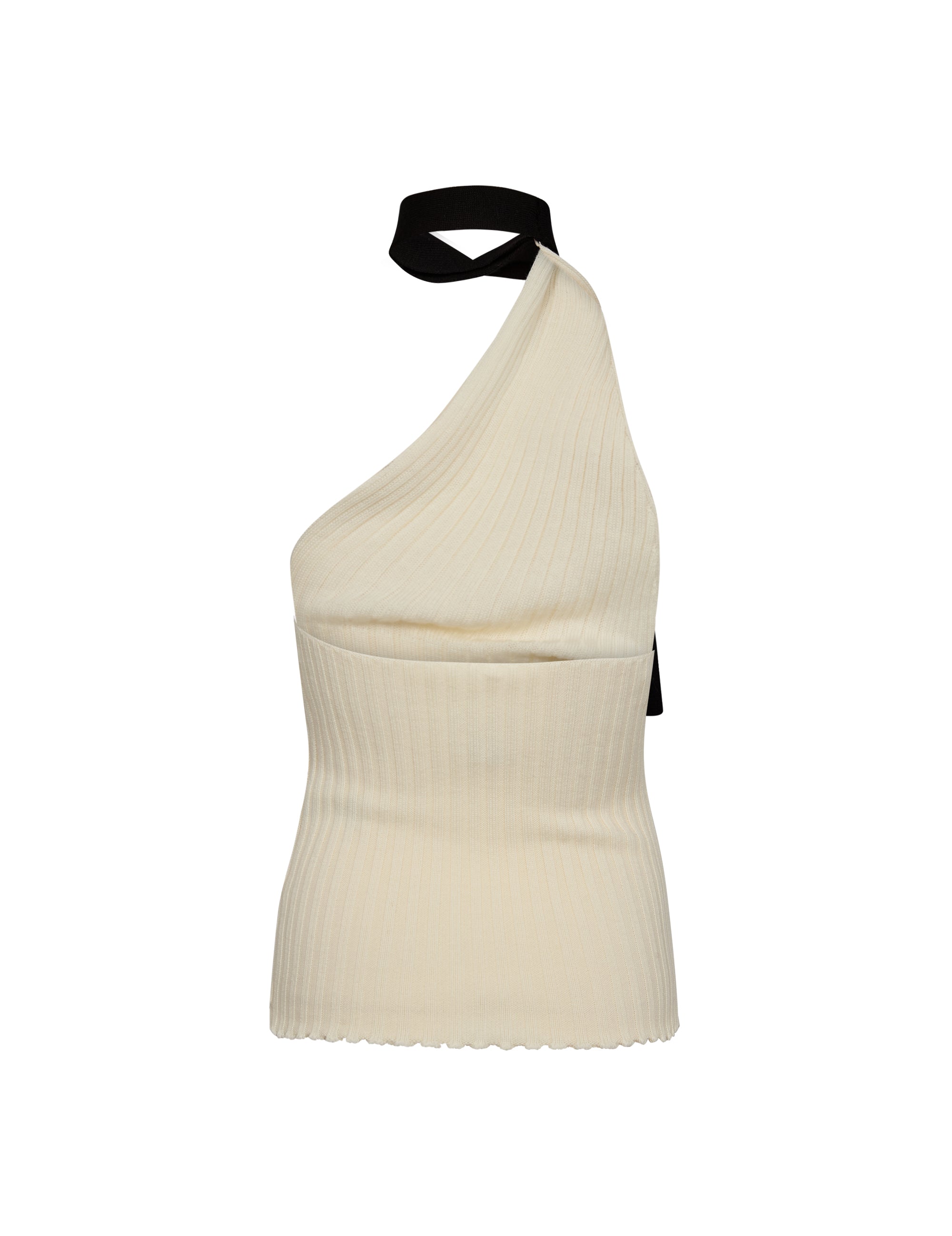 A lightweight, semi-transparent top crafted in 100% merino wool with a single diagonal strap that creates an asymmetric look.